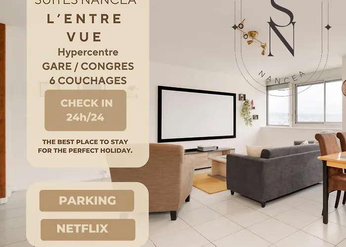 Este apartamento de 70 m^2, L 'Entre Vue - Nancy Gare Congres - 6 Pers - Parking, goza de vistas a la ciudad y se encuentra a 450 metros del rue Saint-Georges. Este apartamento ofrece instalaciones modernas, como Wi-Fi y servicios esenciales como un aparcamiento para los que viajan en coche.